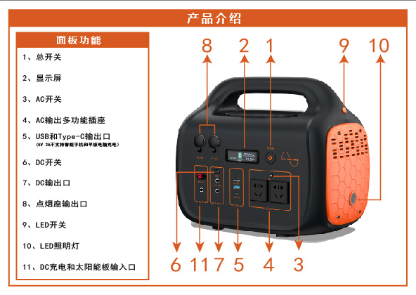 - Tas atbalsta uzlādi un izlādi vienlaikus. Tam ir plašs lietojumu klāsts. To var izmantot kā tiešsaistes UPS barošanas avotu vai kā āra avārijas rezerves barošanas avotu. Tas var apmierināt iekštelpu medicīnas aprīkojumu, mazus printerus, dažādas lampas, mazu zivju tvertņu sildītājus, piezīmjdatorus un āra kempingus. To izmanto, ja ir nepieciešams apgaismojums un maiņstrāvas padeve tādos gadījumos kā fotografēšana, ugunsgrēka avārija, ārkārtas glābšana un katastrofu seku likvidēšana.