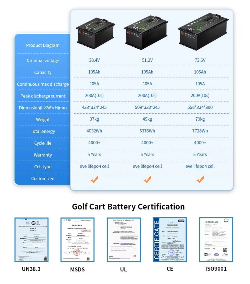 | Pieteikums | Golf cart 【We also provide power batteries for forklifts, industrial vehicles (VGA), ATV, UTV and so on.】 | |||