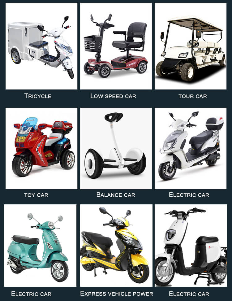 ♦ E-automašīna, golfa ratiņi/automašīna, e-velosipēds, motorollers, RV, AGV, jūras, tūristu automašīna, treileri, ratiņkrēsls, e-slaucītājs, grīdas tīrītājs,