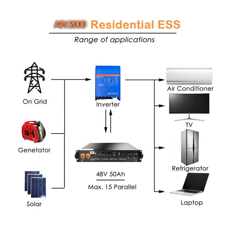 1.AIN2000 48v saules sistēmas akumulators ir izstrādāts ar augstas veiktspējas LFP šūnu 3,2 V 50Ah un EV standarta struktūru, lai garantētu drošību un izcilu kalpošanas laiku.