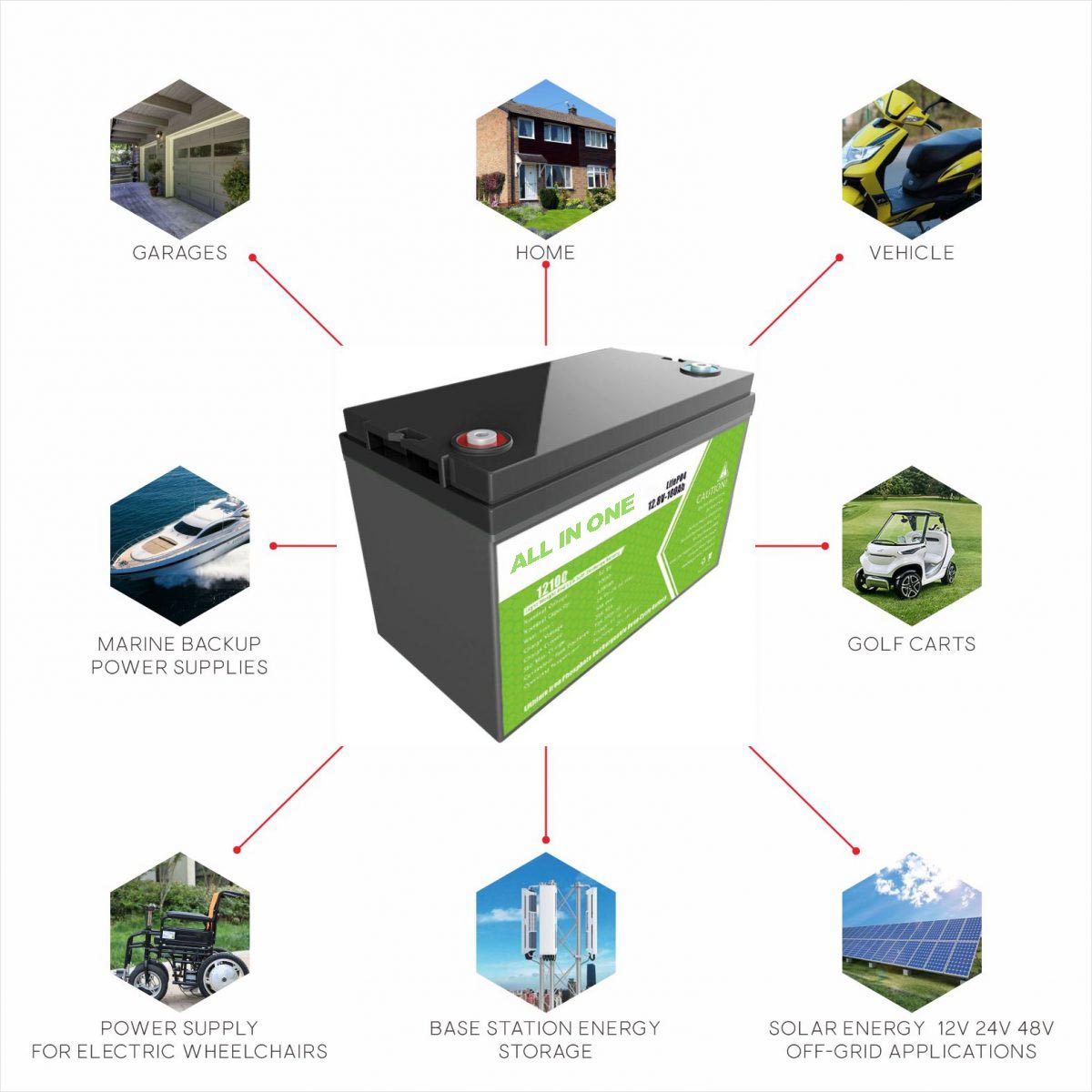 E-automašīna, E-autobuss, Golfa trolleris / automašīna, E-velosipēds, Motorollers, RV, AGV, Jūras, Tūristu automašīna, Karavāna, Riteņu krēsls, E-kravas automašīna, E-sūcējs, Grīdas tīrītājs, E-gājējs utt.
